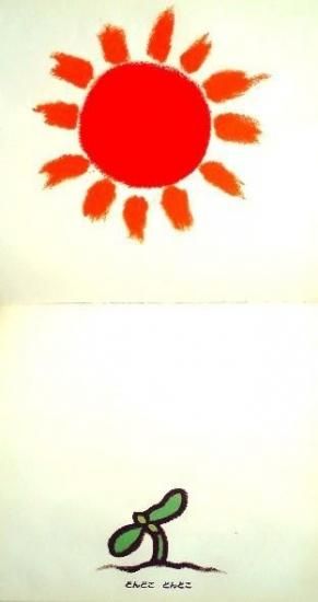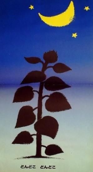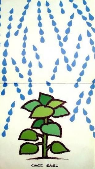 ちいさなたねが とん つちのなかの ちいさなたねが どんどこ どん どんどこ どんどこ どんどこ どんどこ 本文より。太陽のひかりや、雨のめぐみををいっぱいにあび、ときには風がふき、ひまわりは元気に育ちます。