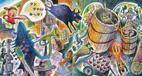 かくれんぼするものよっといで じゃんけんぽん、わーい、チョキかったカボちゃんおにだ 本文より。町の中でカボちゃんが一人ずつ友だちをみつけていきますが、ページの見開きごとに窓があって、覗いてみたりしながら楽しく読み進めます。
