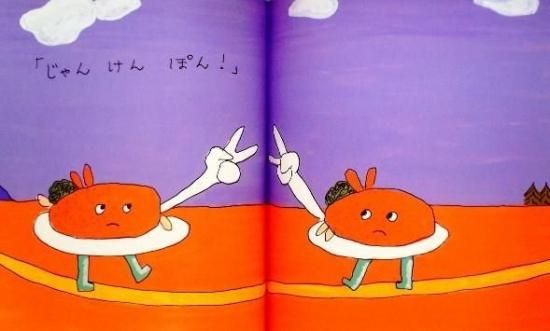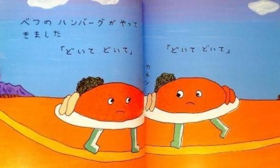 ハンバーグが やってきました ポテトと ほうれんそうと にんじんが のっています べつのハンバーグが やってきました 「どいてどいて」「どいてどいて」 けんかがはじまりました グチャ グチャ グチャ グチャ ハンバーグー 本文より。解決策はやっぱり・・・。