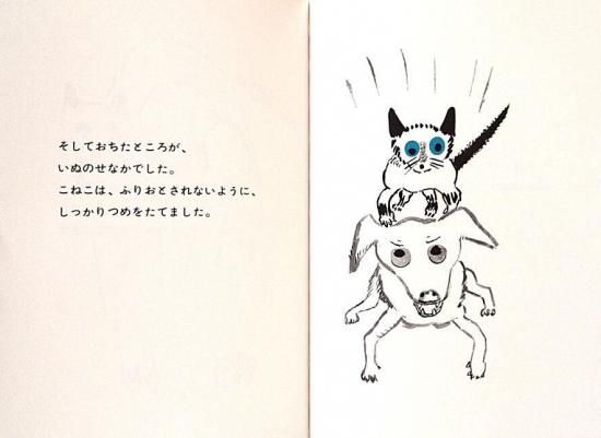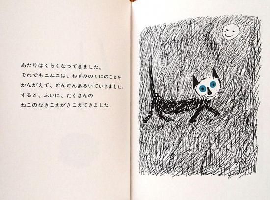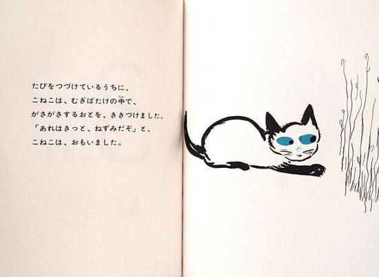 むかし、青い目の げんきなこねこが おりました。あるとき、こねこは、ねずみのくにを みつけに でかけました。こねこは、いさみに いさんで、でかけました。なにしろ、ねずみのくにを みつけたら、もう おなかをすかすことが ありませんもの。本文より。こうして青い目のこねこは、ねこ特有のポジティブさで旅をつづけます。112Pありますが文は短めです。