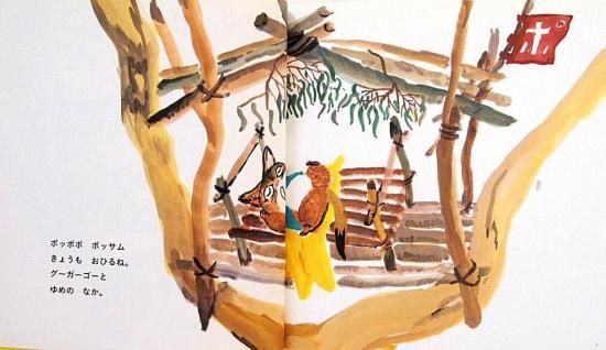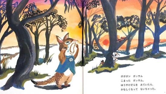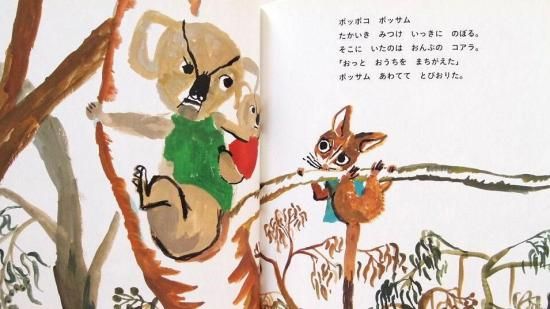 ポッポポ ポッサム きょうも おひるね。グーガーゴーと ゆめのなか。ところが ポッサム ねぼけて おちた。ポッポッ ポッサム どのきが おうちか わからない。ポッサムまいご ポッサムまいご どのきが おうちか わからない。本文より。