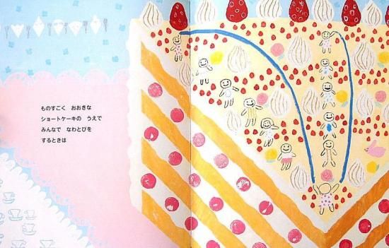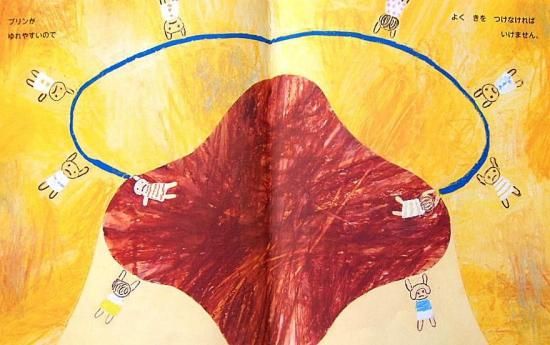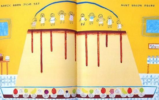 ものすごくおおきな プリンのうえで みんなで なわとびをするときは プリンが ゆれやすいので よく きをつけなければいけません。本文より。「ものすごくおおきなホットケーキのうえ」や「ものすごくおおきなショーケーキのうえ」などの上でなわとびをするときは・・・