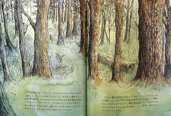 アントニオは、深い森にかこまれた、みずうみのほとりにすんでいました。近くに子どもがいなかったので、アントニオの友だちは、はたらくおとなたち。動物をさがして、ひとりで森を歩くことも好きでした。