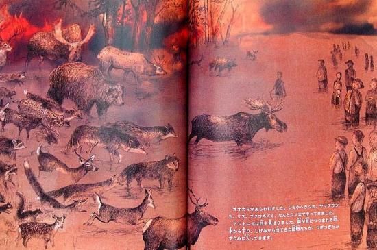 ある夏、おそろしい山火事がおきました。にげる場所は、ただひとつ──みずうみです。人間も、動物も、必死に生きのびようとしたそのとき、アントニオの目の前で、思いもよらないことがおこったのです・・・。本書紹介文より。