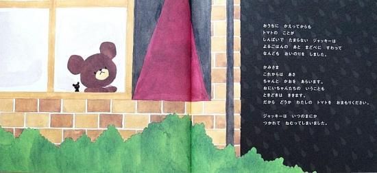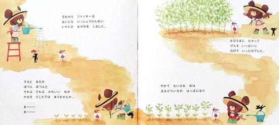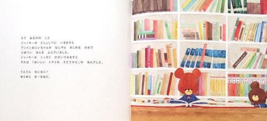 さて あるひのこと。ジャッキーが としょしつに いきますと アントンおにいちゃんが なにやら まじめなかおで ぶあついほんを よんでいました。ジャッキーが こっそり のぞいてみますと それは「おいしいトマトの そだてかた」のほんでした。