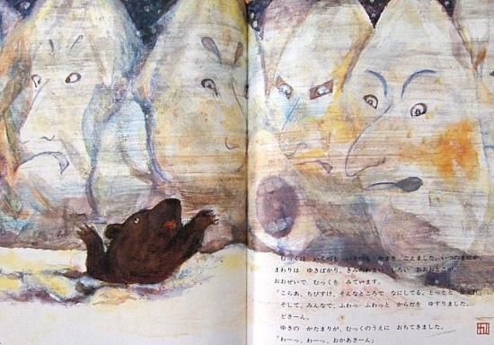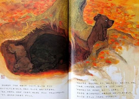 あるひ、かあさんぐまは こぐまたちをよんで いいました。「さあ、ぼうやたち、よくおきき。これから さむいふゆが くるの。くまはみんな、ふゆのあいだ、ほらあなの うちのなかで じっとねむって すごすのよ。」ところが すぐにあきてしまった こぐまのむっくは、こっそり ほらあなを 抜け出します。「ぼくはげんきな こぐまのむっく。ふゆじゅうねてるなんて ごめんだーい。そうだ、はるのところまで いってみよう」 本文参照。