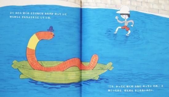 ぼくの ささぶねをみて にんじんの にいさんが「やあ、こんにちは。」というので ぼくも おじぎをした。 本文より。