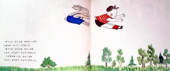 ゆうじは のはらで すばらしいぼうを みつけました。「すごい!まほうのつえだ!」ちょうど そのとき、「いいものみつけた!」と うさぎのキックが とんできました。ふたりは、かけっこをして かったほうが、このぼうを もらうことにしますが・・・。本文参照。