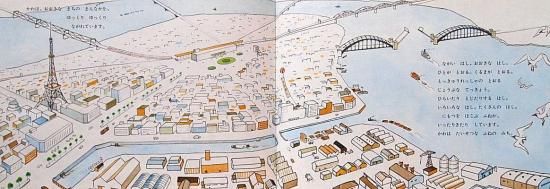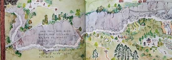 高い山の雪解け水から、ダムの発電所、田んぼのわきを緩やかに流れ、最後は海へ。横長のページに壮大な川の旅が描かれています。