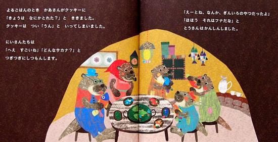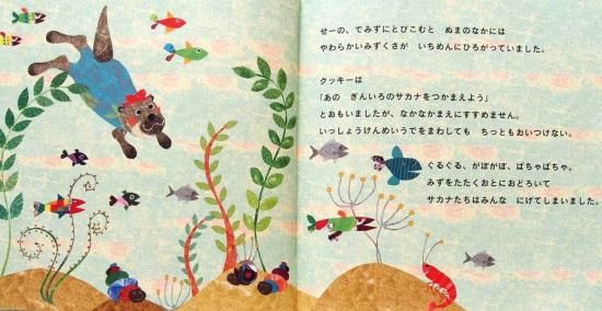 かわうそクッキーは とってもくいしんぼう。いつも とうさんや ふたりのにいさんに ごはんをねだっています。 あるひ、とうさんがいいました。「クッキーも そろそろサカナをとれるようにならなきゃね」 本文より。本書は以前ユニクロで、Tシャツ・紙袋と一緒にセット販売されていました。