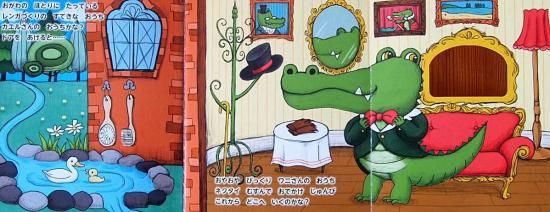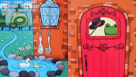 まどからのぞくと、カエルさん、でも、ドアをあけると・・・あれ?あれれ?