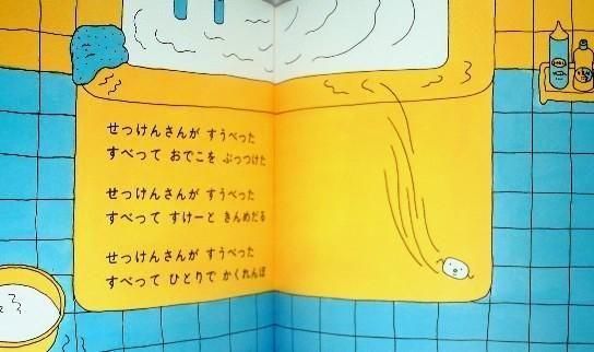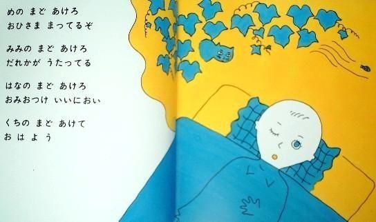 めのまど あけろ おひさま まってるぞ みみのまど あけろ だれかが うたってる はなのまど あけろ おみおつけ いいにおい くちのまど あけて お は よ う ほっぺたのはらに あめがふる おでこがおかに あめがふる はなのやまにも あめがふる めとめのいけにも あめがふる たおるでふいたら あおぞらみえた 本文より。子どもの想像力を刺激するリズミカルな文で、子どもの一日をつづっています。