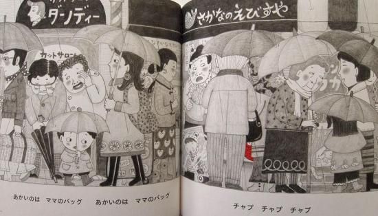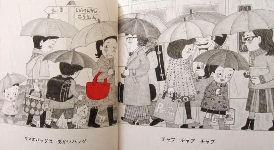 かささして ママとおでかけ ながぐつはいて チャプ チャプ チャプ ママのバッグは あかいバッグ チャプ チャプ チャプ 本文より。人混みのなか、ママが見当たらなくなってしまった男の子は、ママの赤いバッグを探しますが・・・