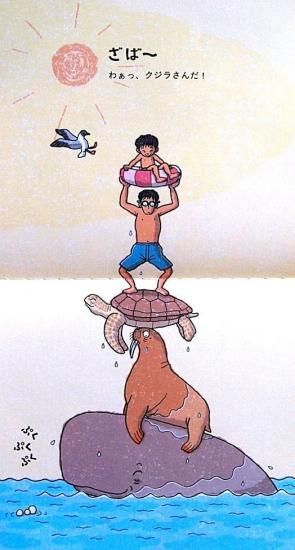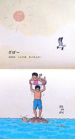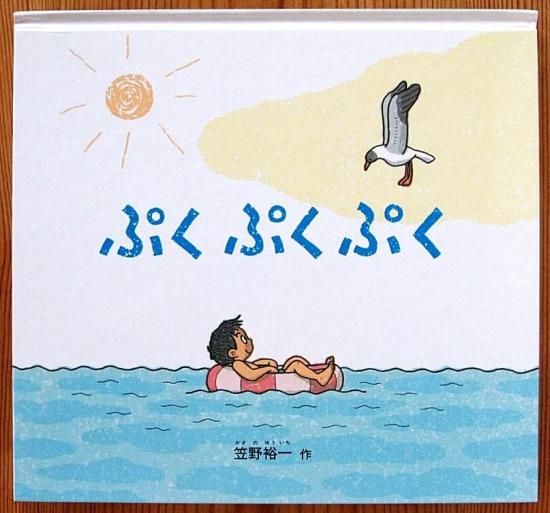 あつい あつい なつのひ。うきわに のって、ぷかぷか ぷ〜かぷか いいきもち。あれれ、うみの なかから ぷくぷくぷく なんだ? 本文より。