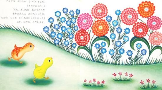 お父さんがお花をプレゼントするのを見て、うずらちゃんは宝物をお母さんに贈ろうと決意し、さっそく、お友だちのひよこちゃんと一緒に宝探しに出かけます。 本書紹介文より。
