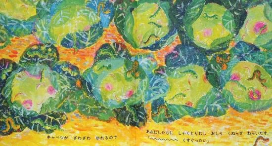 キャベツの きゃべたが ねていると、はねを ひらひら モンシロチョウ。