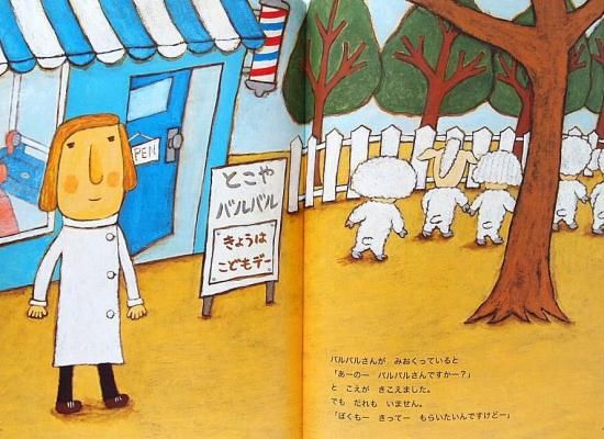 まちのはずれに あおいやねの ちいさなみせがあります。バルバルさんの とこやです。きょうは『こどもデー』。おきゃくさんは こどもたちです。本文より。