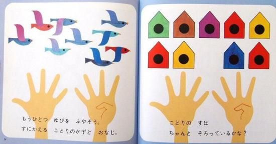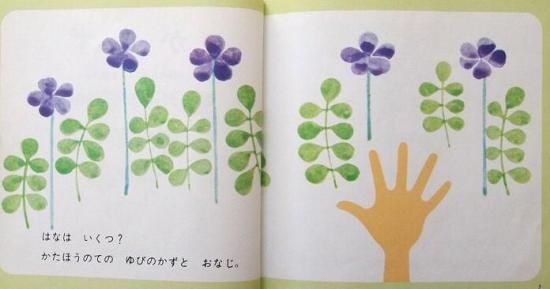 はなは いくつ? かたほうの ての ゆびの かずと おなじ。クリスマスツリーの ほし。この とがった さきも ゆびと おなじかず。かたほうの ての ゆびと おなじかずは 5。本文より。イラストを見ながら、指をみながら数えます。