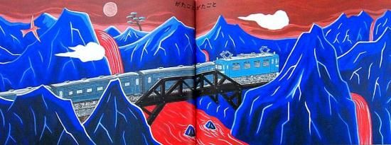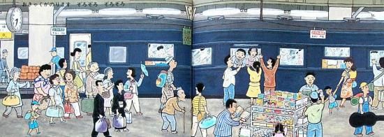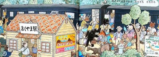 「おきゃくがのります ぞろぞろ ぞろぞろ」お客さんが電車に乗ったら出発です。「がたごと がたごと」町を抜け、田舎を通って『おくやま駅』に着くと、あれれ、降りてきたお客さんは人間ではなく動物たちでした。そして違う電車にお客さんが乗り込み、トンネルを抜けると・・・