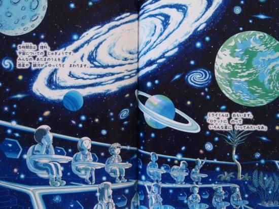 授業では無重量遊泳をしたり、昔の都市を学んだり、立体映像の惑星や銀河が頭の上を飛んでいったり。