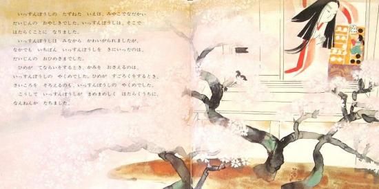 あるひのこと、いっすんぼうしは、おじいさんとおばあさんにむかって、「わたしは みやこにのぼって、ひとはたらきしてこようと おもいます。しばらくのおいとまを ください」といいました。 本文より。