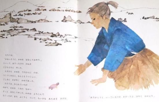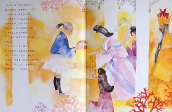 たすけた亀の背にまたがって、竜宮城をおとずれる浦島太郎。よく知られたむかし話を、幻想的なみずみずしい色調で描いた絵本。本書紹介文より。
