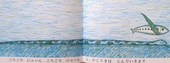 海のうえ、山のうえ、UFOの横をすりぬけ、ヘビのうえを飛んでいきます。想像力をかきたてる絵本です。