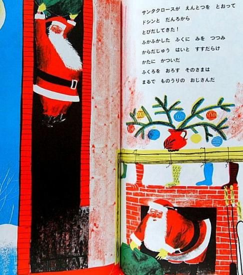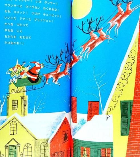 「ほれ ダッシャー! いけ ダンサー! プランサーにヴィクセン おくれるな! それ コメット! つづけ キューピッド! いいこだ ドナーとブリッツェン! かべをつたって やねをこえ ちからをあわせて かけあがれ!」本文より。